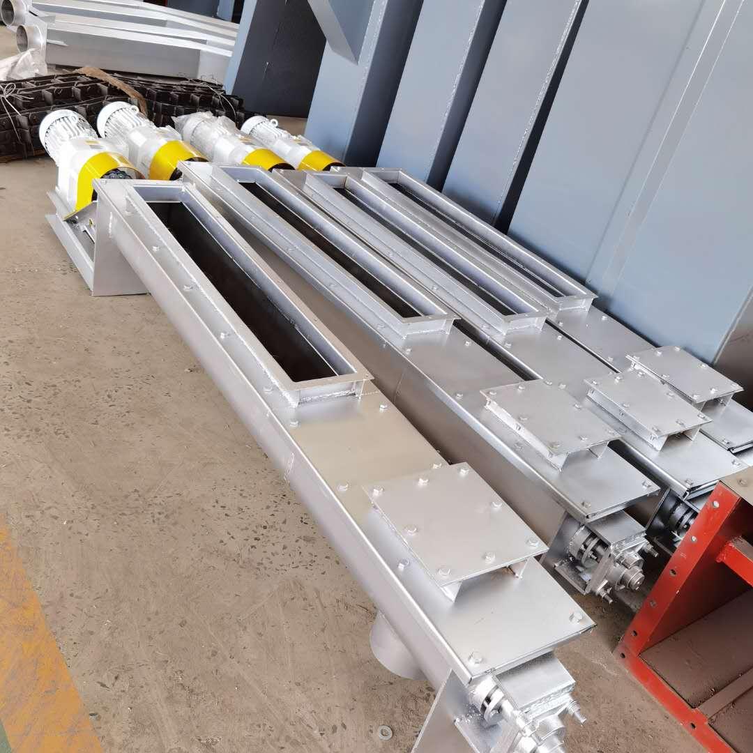 螺旋輸送機(jī)的運(yùn)行原理是通過(guò)螺旋軸的轉(zhuǎn)動(dòng),把物料在葉片推力的作用下沿著輸送機(jī)的機(jī)體向前移動(dòng)。物料在中間軸承的運(yùn)移,則是依靠后面前進(jìn)著的物料的推力。所以,物料在輸送機(jī)中的運(yùn)送,完全是一種滑移運(yùn)動(dòng)。一般我們?cè)O(shè)計(jì)的螺旋輸送機(jī)的進(jìn)料口與輸送機(jī)的驅(qū)動(dòng)裝置在同一方向,便于推動(dòng)物料,使輸送機(jī)的動(dòng)力減輕。葉片的面型根據(jù)輸送物料的不同有實(shí)體面型、帶式面型、葉片面型等型式。螺旋輸送機(jī)的螺旋軸在物料運(yùn)動(dòng)方向的終端有止推軸承以隨物料給螺旋的軸向反力,在機(jī)長(zhǎng)較長(zhǎng)時(shí),應(yīng)加中間吊掛軸承,以免因?yàn)槁菪S和葉片過(guò)長(zhǎng),加上自身重力時(shí)間長(zhǎng)了,出現(xiàn)同心度偏差問(wèn)題。我們?cè)O(shè)計(jì)的輸送機(jī)可以根據(jù)客戶的要求做進(jìn)出料口的方向,數(shù)量,及螺旋葉片的旋向。